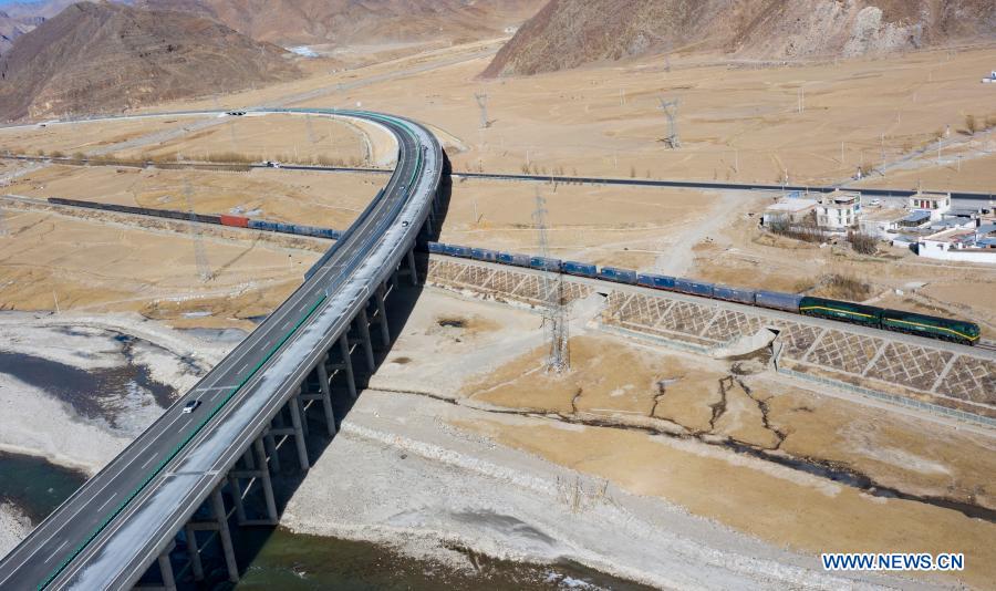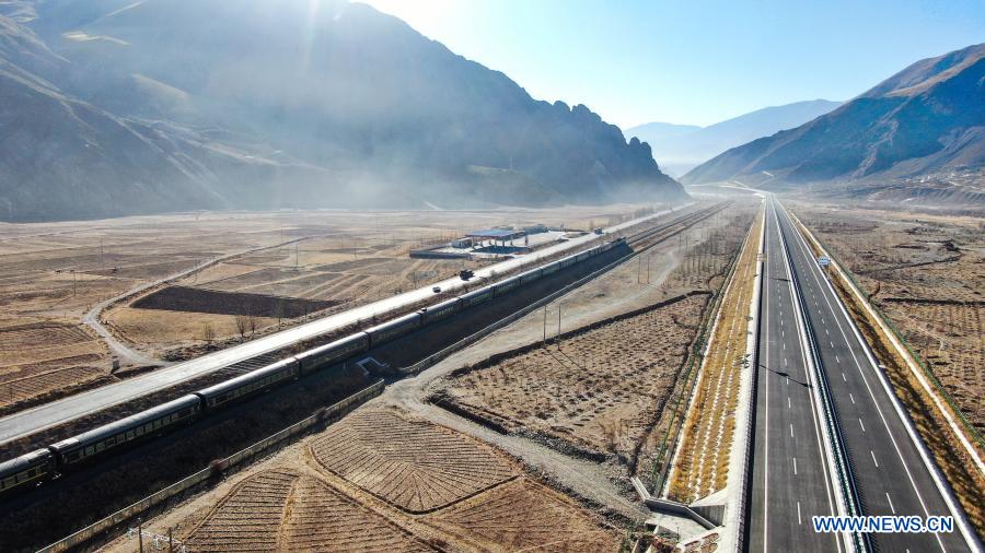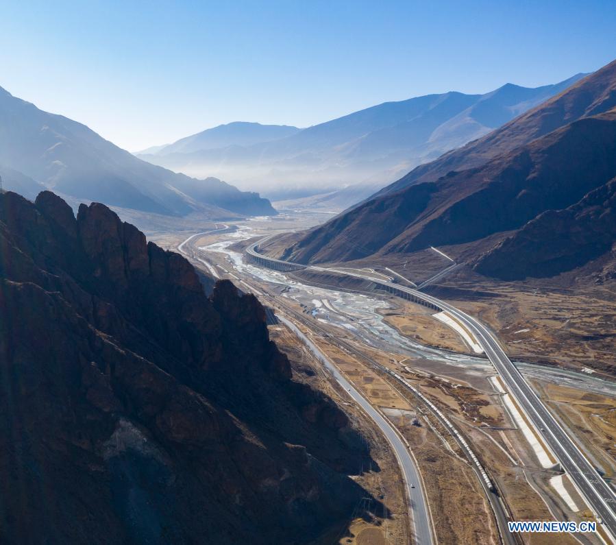 Zdjęcie lotnicze wykonane 28 stycznia 2021 roku - bezkolizyjne skrzyżowanie autostrady Lhasa-Nagqu i linii kolejowej Qinghai-Tybet. (Foto:Xinhua / Purbu Zhaxi)