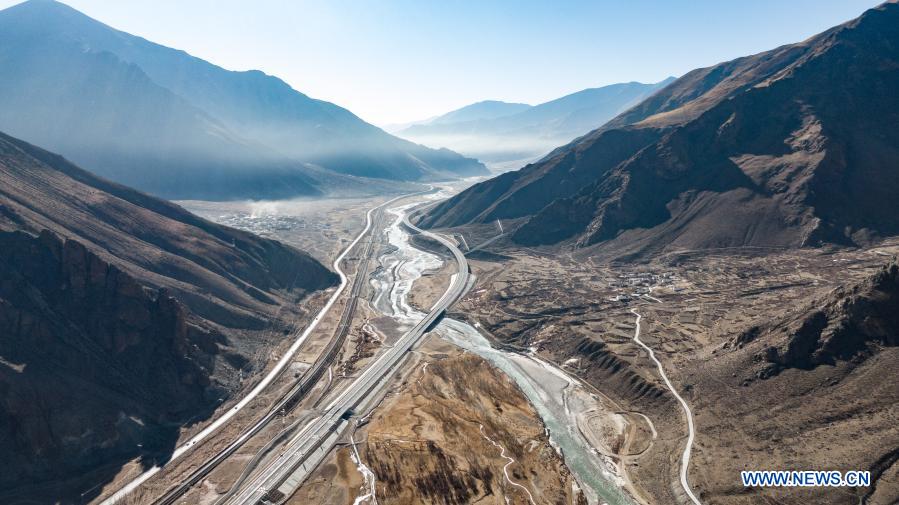 Zdjęcie lotnicze wykonane 28 stycznia 2021 r. - (od lewej do prawej) odcinek drogi krajowej nr 109, linia kolejowa Qinghai-Tybet oraz autostrada między Lhasą a Nagqu w Tybetańskim Regionie Autonomicznym. (Foto:Xinhua / Sun Fei)