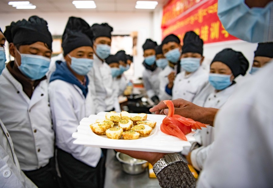 Młodzi ludzie z okolic Nyingchi uczą się gotować w szkole zawodowej w Nyingchi, w Tybetańskim Regionie Autonomicznym, 20 listopada 2020 r. (foto:Xinhua/Purbu Zhaxi)