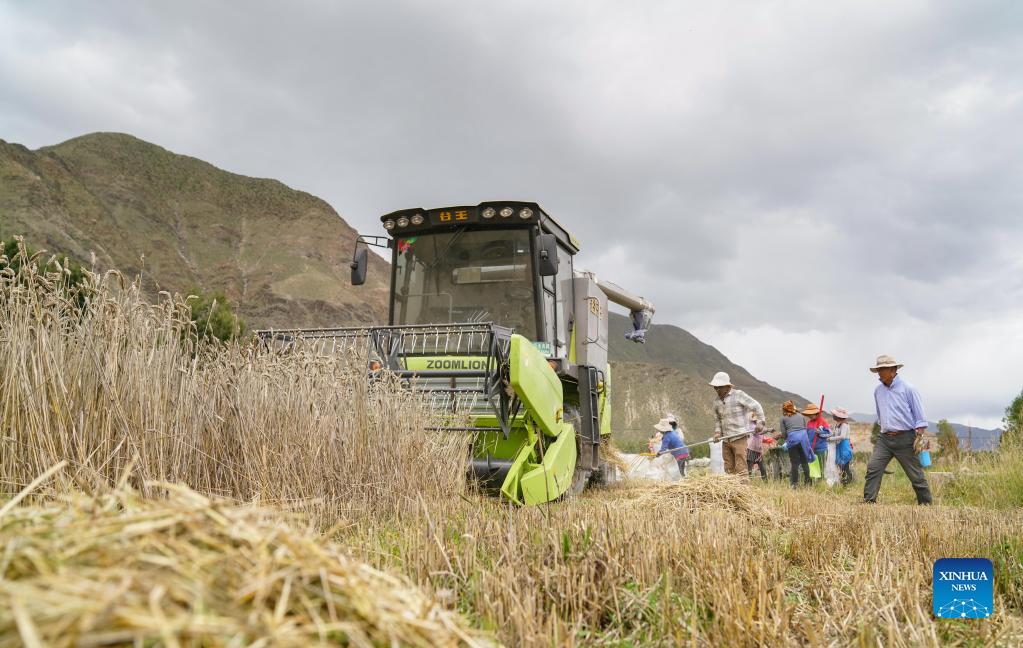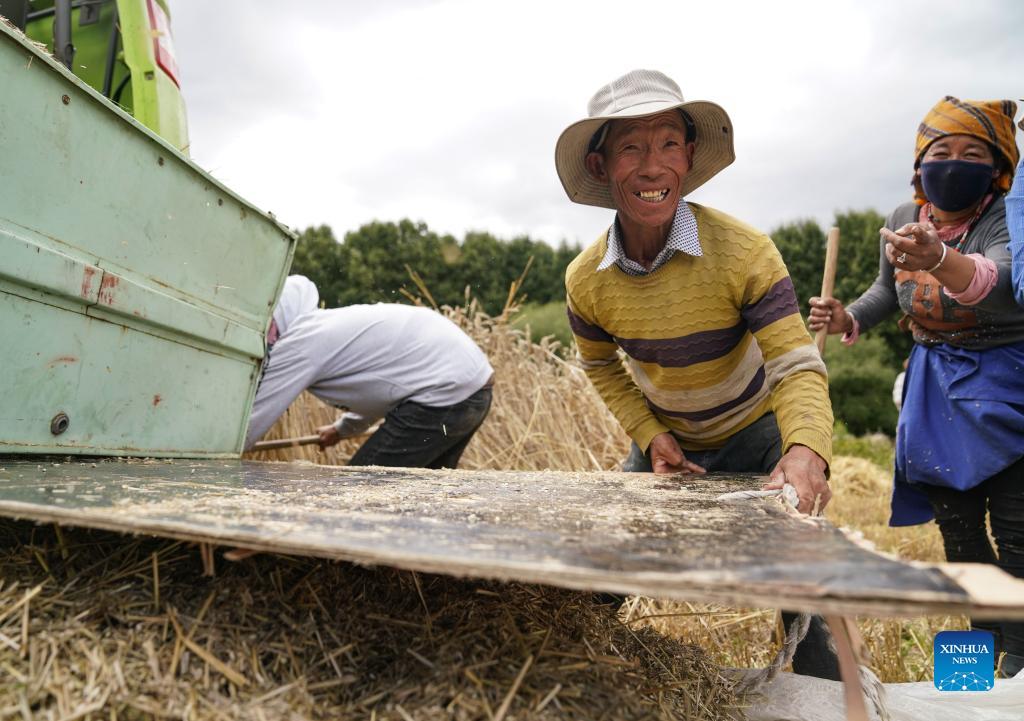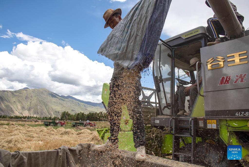Opróżnianie kombajnu z ziarna - pole we wsi Kere w dystrykcie Dagze w prefekturze Lhasy. [Zdjęcie: Sun Ruibo/Xinhua]