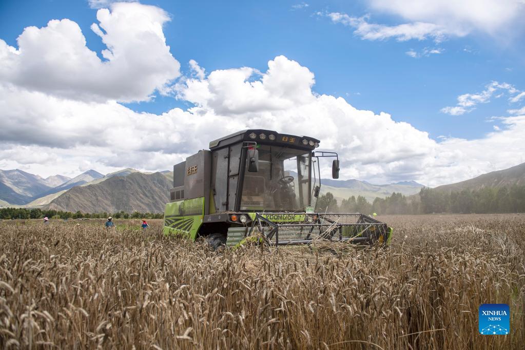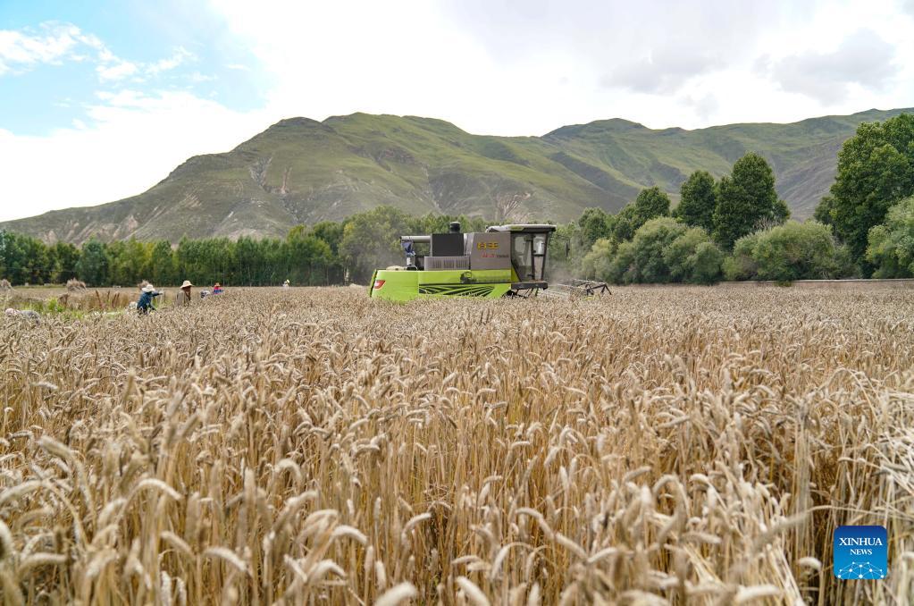 Zbiór ziarna kombajnem bardzo skraca pracę. Pole we wsi Kere w dystrykcie Dagze w prefekturze Lhasy[Zdjęcie: Jigme Dorje/Xinhua]