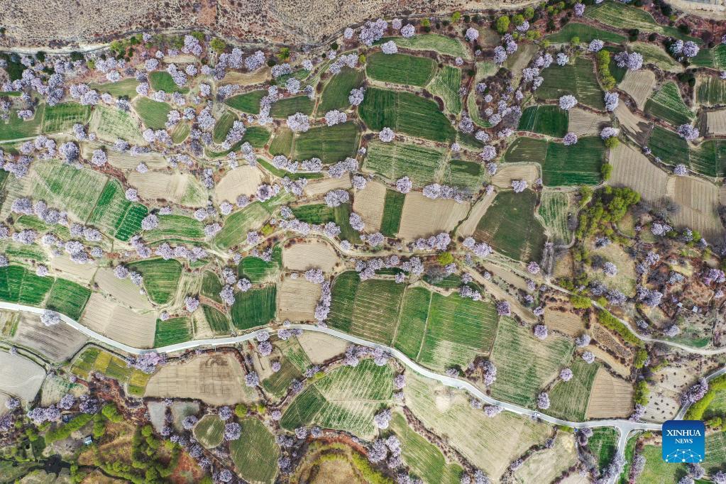 Zdjęcie lotnicze - kwitnące brzoskwinie w wiosce w Nyingchi. [Fot.Xinhua/Lodro Gyatso]