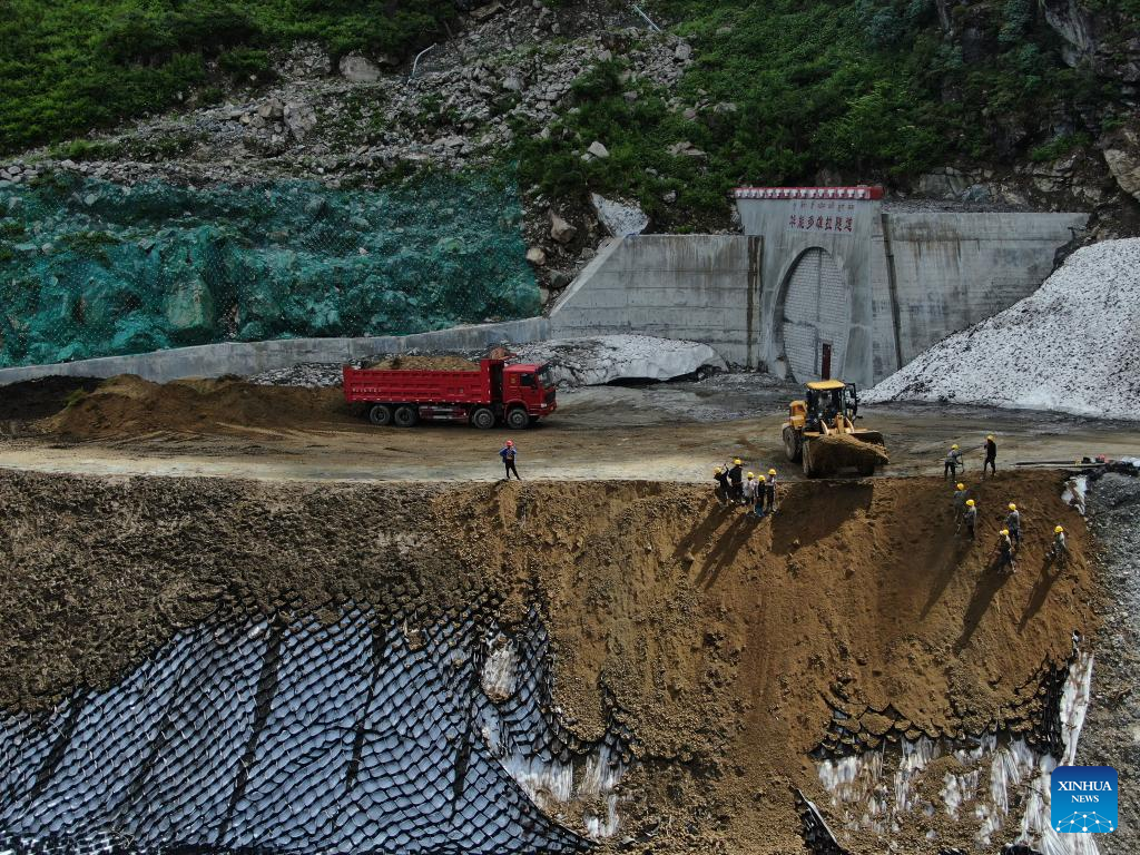 Zdjęcie lotnicze zrobione 18 sierpnia 2020 r. - plac budowy zjazdu z tunelu Doxong Pass na autostradzie łączącej gminę Pad w prefekturze Nyingchi i powiat Medog w Tybetańskim Regionie Autonomicznym. Droga o długości 67,22 km łączy gminę Pad w prefekturze Nyingchi i powiat Medog. Jest to drugie połączenie drogowe do Medog, po pierwszym łączącym powiat z gminą Zhamog w powiecie Bomi.