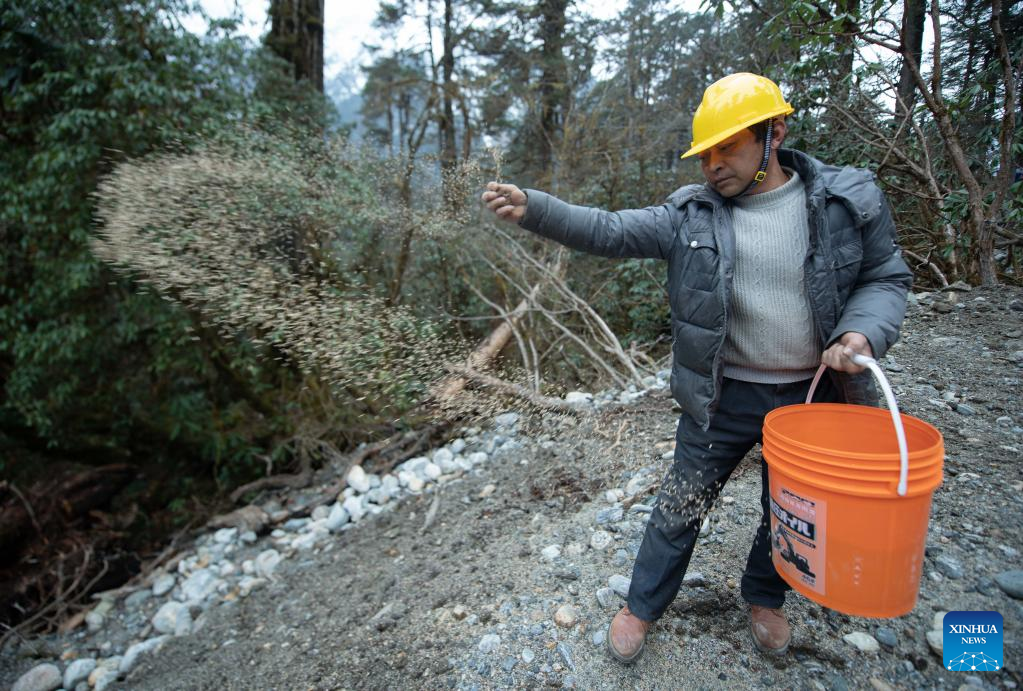 Robotnik wysiewa nasiona w pobliżu autostrady łączącej gminę Pad w prefekturze Nyingchi z powiatem Medog w Tybetańskim Regionie Autonomicznym, 11 marca 2021 r. Droga o długości 67,22 km łączy gminę Pad w prefekturze Nyingchi i powiat Medog. Jest to drugie połączenie drogowe do Medog, po pierwszym łączącym powiat z gminą Zhamog w powiecie Bomi.