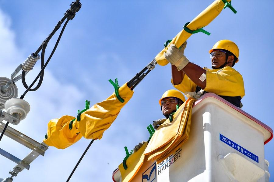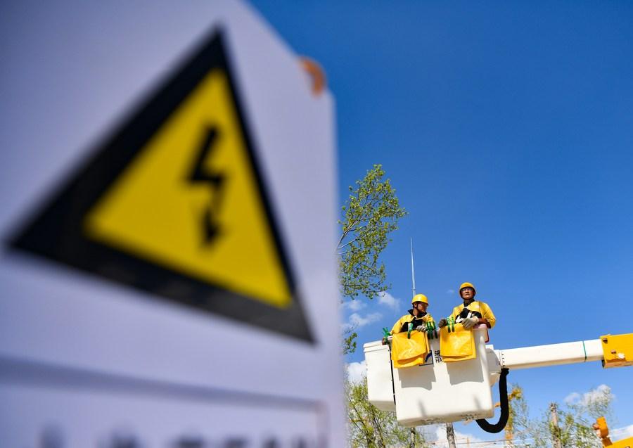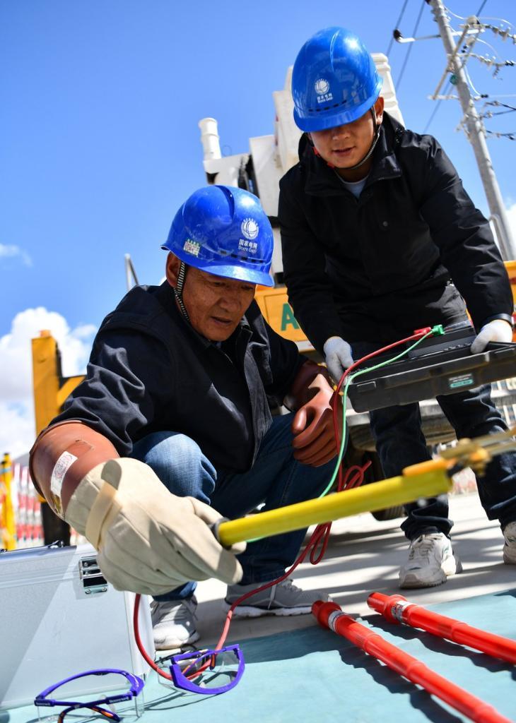 Zhaxi Nyima (z lewej) testuje rezystancję izolacji w Lhasie, stolicy Tybetańskiego Regionu Autonomicznego , 26 kwietnia 2023 r. (Xinhua/Liu Zhoupeng)
