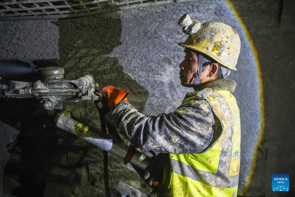 Wiertacz pracujący w tunelu Phupa w Tybetańskim Regionie Autonomicznym, 4 grudnia 2023 r. We wtorek ukończono budowę głównego odcinka drogi ekspresowej łączącej miasta Lhasa i Xigaze w Tybecie. Wlot lewej nitki tunelu Phupa, ostatniego tunelu na prawie 167-kilometrowej drodze ekspresowej Lhasa-Xigaze, został przewiercony we wczesnych godzinach porannych we wtorek, co oznacza ukończenie głównej części tej drogi. (Xinhua/Shao Zedong)