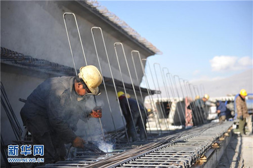 Pracownicy układają stalowe zbrojenia na budowie południowego odcinka obwodnicy Lhasy. [Zdjęcie: Xinhua]
