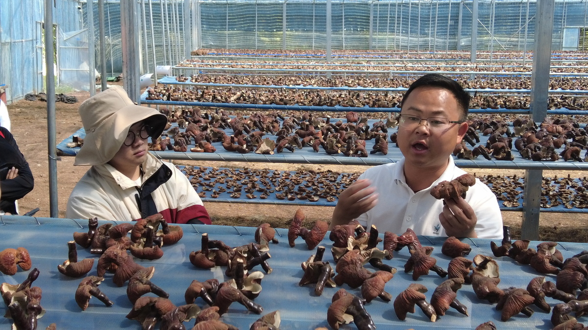 Cheng Pan, lokalny urzędnik partyjny, przedstawia odwiedzającym lokalną odmianę lingzhi. [Zdjęcie: Li Lei/China Daily]