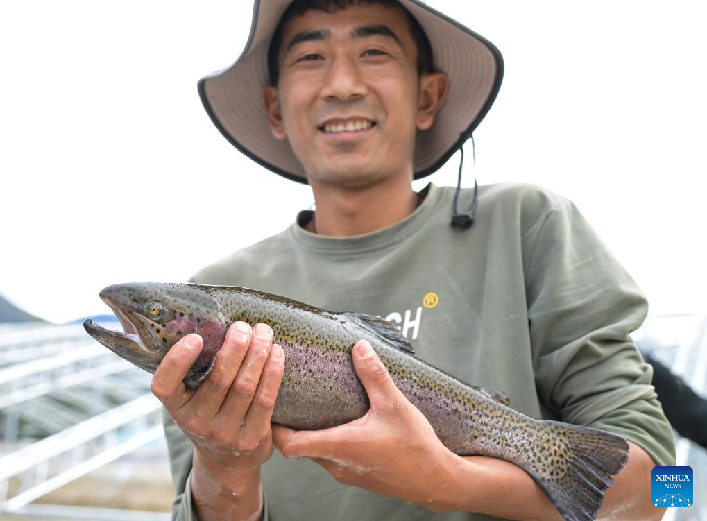 Pracownik farmy Nyima Wangdu prezentuje pstrąga tęczowego wyhodowanego w parku naukowo-technologicznym wyżynnej hodowli ryb Milin Farm w prefekturze Nyingchi, w Tybetańskim Regionie Autonomicznym [Xizang] w Chinach, 24 października 2024 r.Gospodarstwo Milin Farm w Nyingchi przy wsparciu fachowców z prefektury Zhuhai w południowych Chinach rozwija wyżynną hodowlę ryb od 2022 r. Opierając się na sprzyjających warunkach naturalnych Gospodarstwo utworzyło park naukowo-technologiczny wyżynnej hodowli ryb i aktywnie poszukuje odpowiedniego modelu rozwoju lokalnej branży rybnej. Obecnie w gospodarstwie znajduje się ponad 50 000 kilogramów ryb. (Foto: Xinhua/Li He)