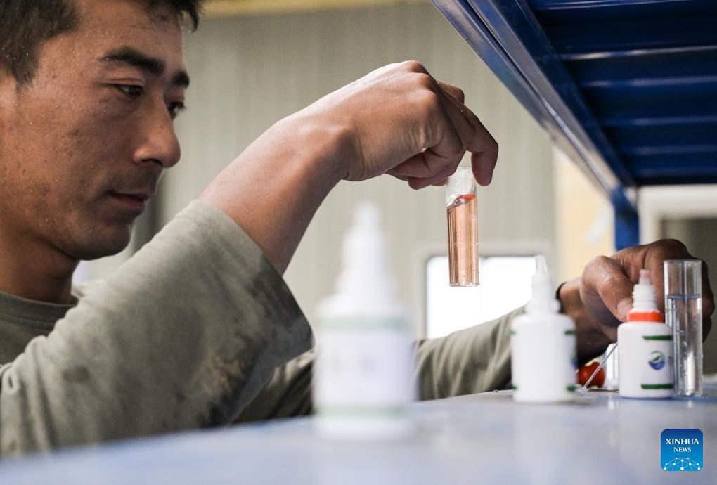 Pracownik farmy Nyima Wangdu bada próbkę wody w parku naukowo-technologicznym wyżynnej hodowli ryb Milin Farm w prefekturze Nyingchi, w Tybetańskim Regionie Autonomicznym [Xizang] w Chinach, 24 października 2024 r. Gospodarstwo Milin Farm w Nyingchi rozwija hodowlę rybołówstwa płaskowyżowego od 2022 r. przy wsparciu miasta Zhuhai w południowych Chinach. Opierając się na sprzyjających warunkach naturalnych Gospodarstwo utworzyło park naukowo-technologiczny wyżynnej hodowli ryb i aktywnie poszukuje odpowiedniego modelu rozwoju lokalnej branży rybnej. Obecnie w gospodarstwie znajduje się ponad 50 000 kilogramów ryb. (Foto: Xinhua/Li He)