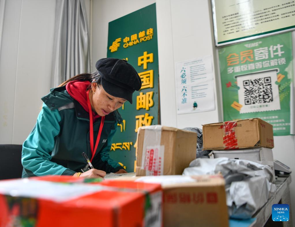 Pracownica poczty rejestruje przesyłki ekspresowe w urzędzie pocztowym w gminie Yumai w mieście Shannan, w Tybetańskim Regionie Autonomicznym w południowo-zachodnich Chinach, 10 czerwca 2023 r. [Zdjęcie/Xinhua]