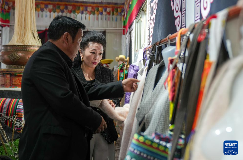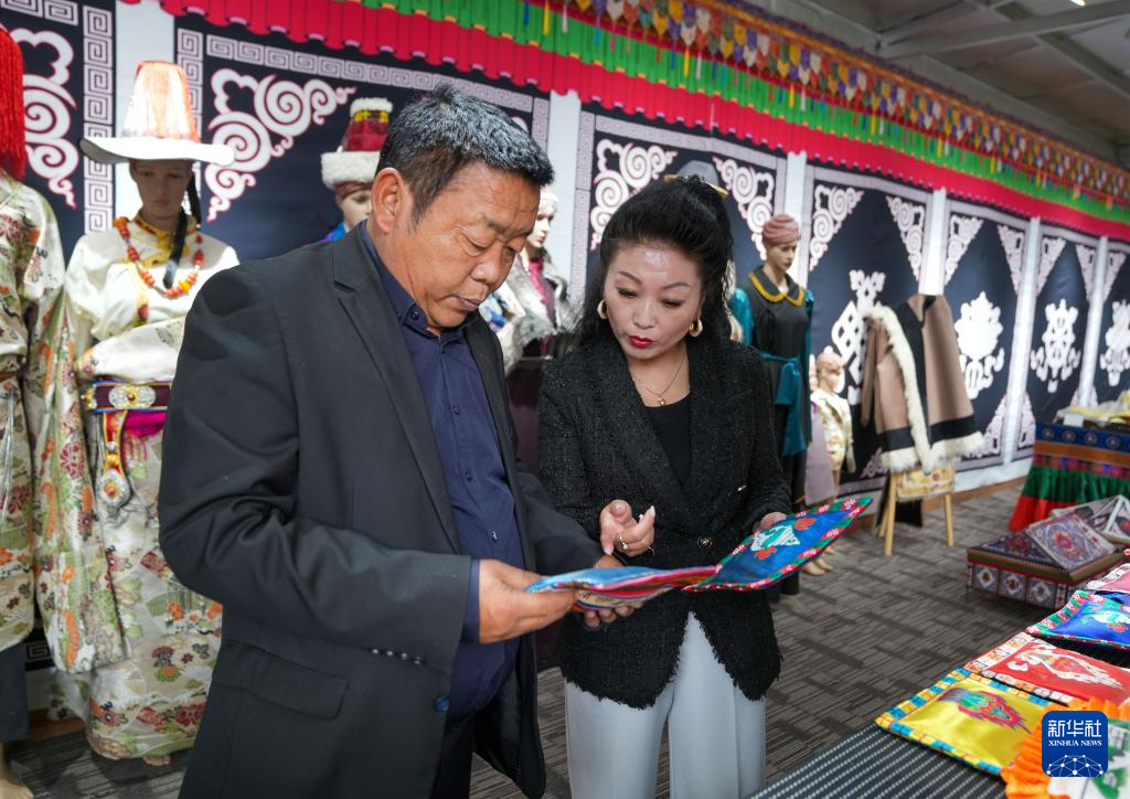Biemba Zhuoka (po prawej) i wicedyrektor Phub Tsering sprawdzają prace wykonane z tkanin przez uczniów na zajęciach krawieckich (zdjęcie zrobione 23 kwietnia). (foto: Xinhua/Jinmei Dorje)
