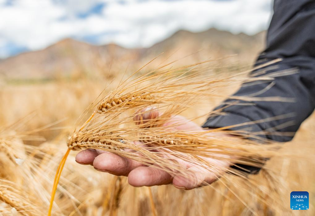 10 23 września 2025 r. Dorodne kłosy jęczmienia górskiego z pola w powiecie Lhunzhub w prefekturze Lhasy, w południowo-zachodnim Tybetańskim Regionie Autonomicznym [Xizang] w Chinach.(Foto: Xinhua/Tenzin Nyida)