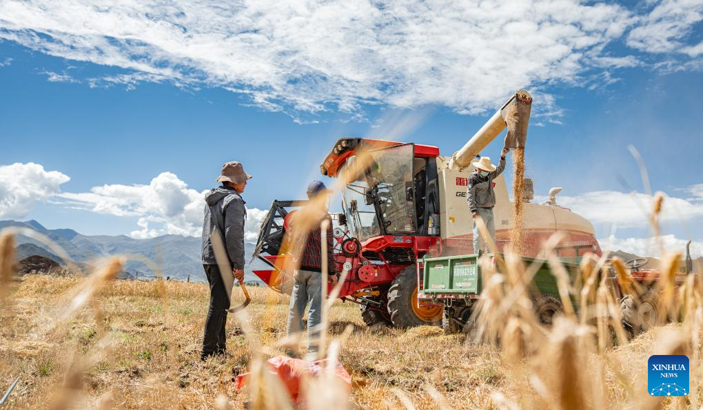 12 Rolnicy zbierają kombajnem jęczmień górski w powiecie Lhunzhub w prefekturze Lhasy, w południowo-zachodnim Tybetańskim Regionie Autonomicznym [Xizang] w Chinach. 23 września 2025 r. (Foto: Xinhua/Tenzin Nyida)
