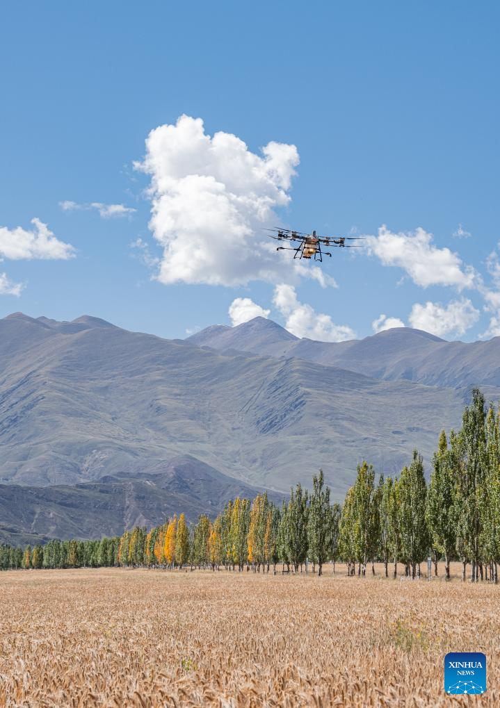 13 Dron rolniczy przelatuje nad polem jęczmienia górskiego w powiecie Lhunzhub w prefekturze Lhasy, w południowo-zachodnim Tybetańskim Regionie Autonomicznym [Xizang] w Chinach. 23 września 2025 r. (Foto: Xinhua/Tenzin Nyida)