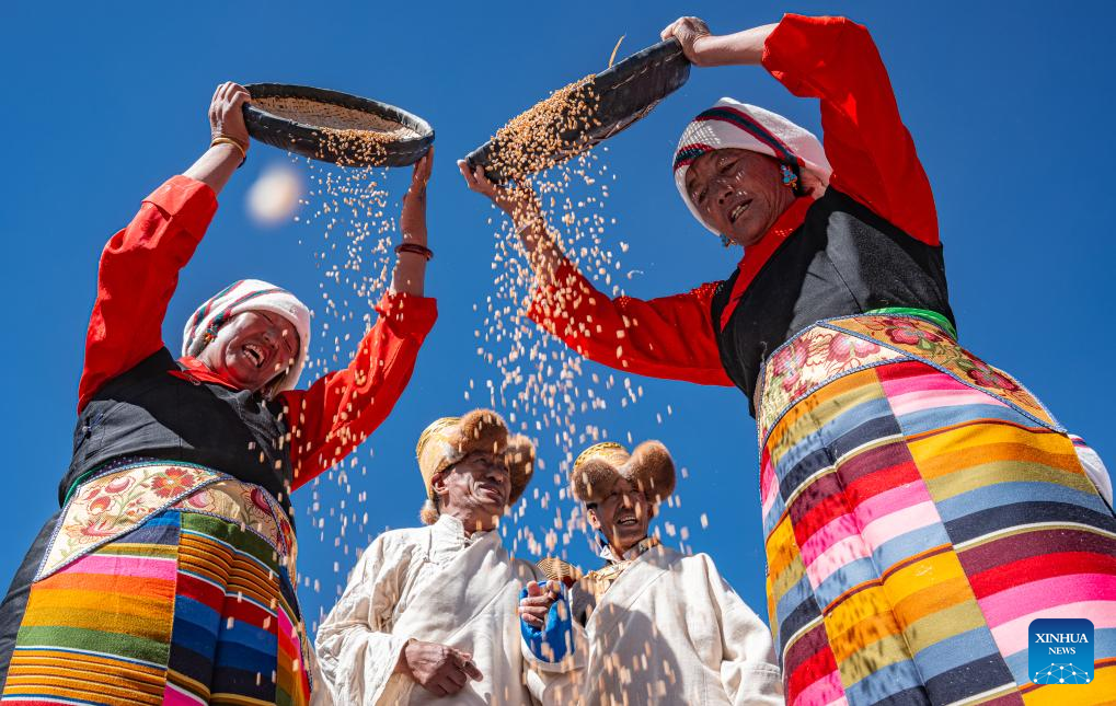 14 Rolnicy przesiewają jęczmień górski w tradycyjny sposób w powiecie Lhunzhub w Lhasa, Autonomiczny Region Xizang w południowo-zachodnich Chinach, 23 września 2025 r. (Foto: Xinhua/Tenzin Nyida)