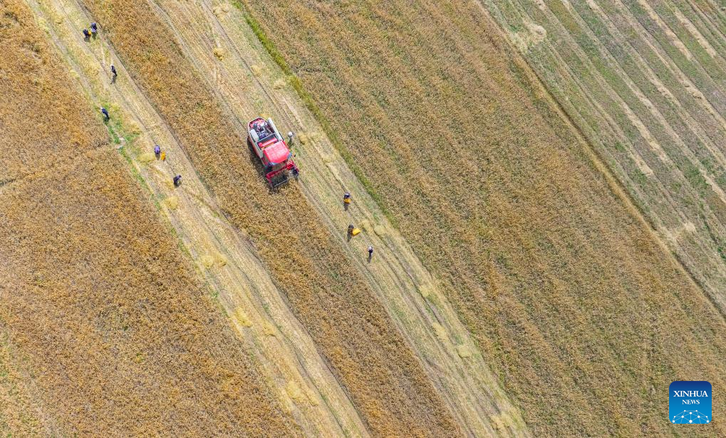 4 Rolnicy pracują na polach jęczmienia górskiego w powiecie Lhunzhub w prefekturze Lhasy, w południowo-zachodnim Tybetańskim Regionie Autonomicznym [Xizang] w Chinach 23 września 2025 r. (Foto: Xinhua/Tenzin Nyida)