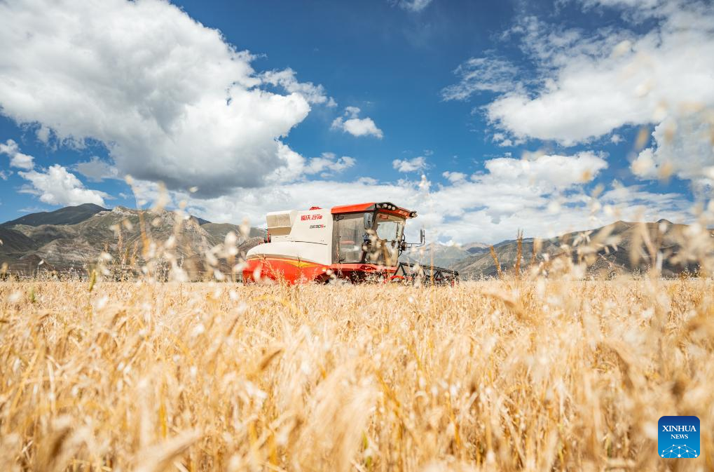 6 Kombajn pracuje na polu jęczmienia górskiego w powiecie Lhunzhub w prefekturze Lhasy, w południowo-zachodnim Tybetańskim Regionie Autonomicznym [Xizang] w Chinach. 23 września 2025 r. (Foto: Xinhua/Tenzin Nyida)