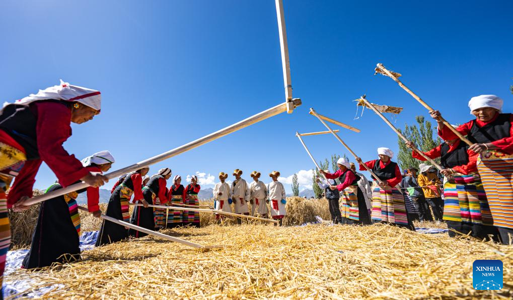 9 Rolnicy młócą zboże w tradycyjny sposób w powiecie Lhunzhub w prefekturze Lhasy, w południowo-zachodnim Tybetańskim Regionie Autonomicznym [Xizang] w Chinach. 23 września 2025 r. (Foto: Xinhua/Tenzin Nyida)