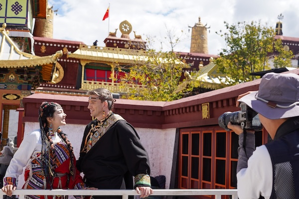 Turyści z Meksyku ubrani w tybetańskie stroje fotografują się na placu świątyni Jokhang. [Zdjęcie/IC]