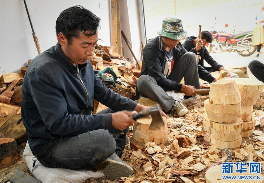 Samdrup, człowiek odpowiedzialny za firmę, pokazuje drewniane misy, które wykonali firmowi rzemieślnicy. [Foto / Xinhua].