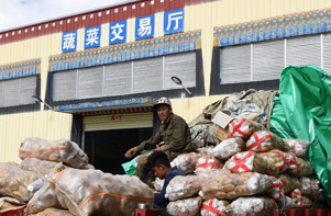 Na zdjęciu: Kilku producentów rolnych spod Lhasy na rynku hurtowym produktów rolno-spożywczych w Lhasie.