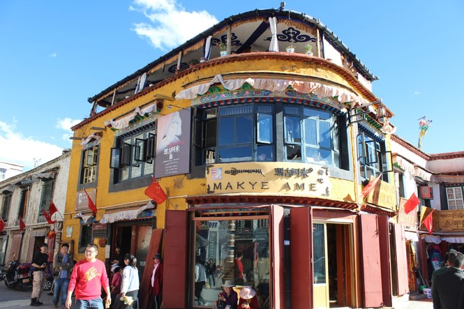 Na starym mieście Lhasy pomiędzy dominującą bielą budynków wyraźnie wyróżnia się żółta restauracja Makye Ame.