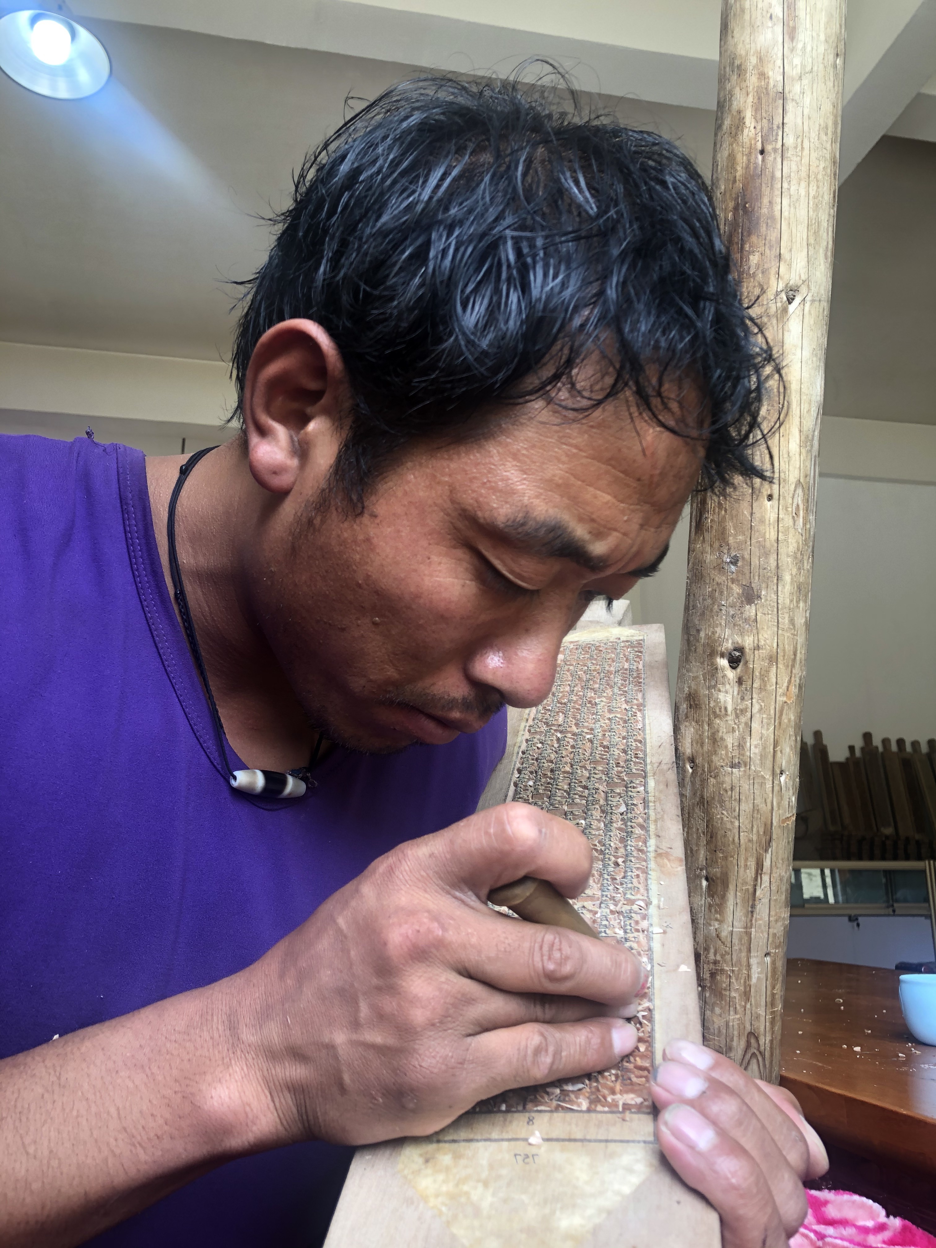 Drzeworytnik wycina skomplikowane figury. [Zdjęcie: Palden Nyima / China Daily]