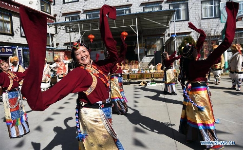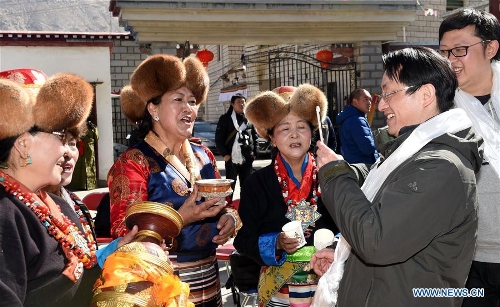 Mieszkańcy dzielnicy Chengguan w Lhasie wznoszą toast za pomyślność w Tybetańskim Nowym Roku, (inaczej Święta Losar),27 lutego 2017 roku (Xinhua / Chogo)