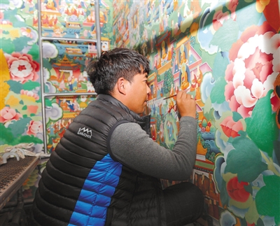 Pracownik pracowni konserwacji odnawia malowidła naścienne w klasztorze Khorzhak w powiecie Burang