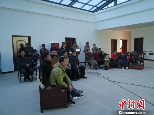 Qila (tylny rząd, czwarty od lewej) wyświetla film rolnikom i koczownikom we wsi Karma na północy Tybetu.
