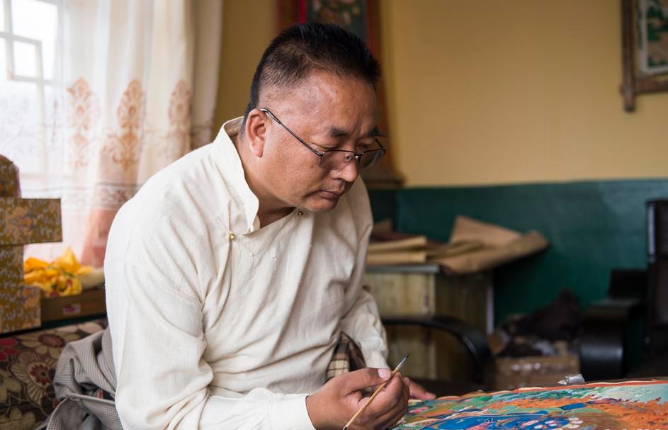 Lungsang, narodowy artysta i dziedzic sztuki malowania Thangki w stylu Miantang jest założycielem galerii sztuki Yusang Thangka.
