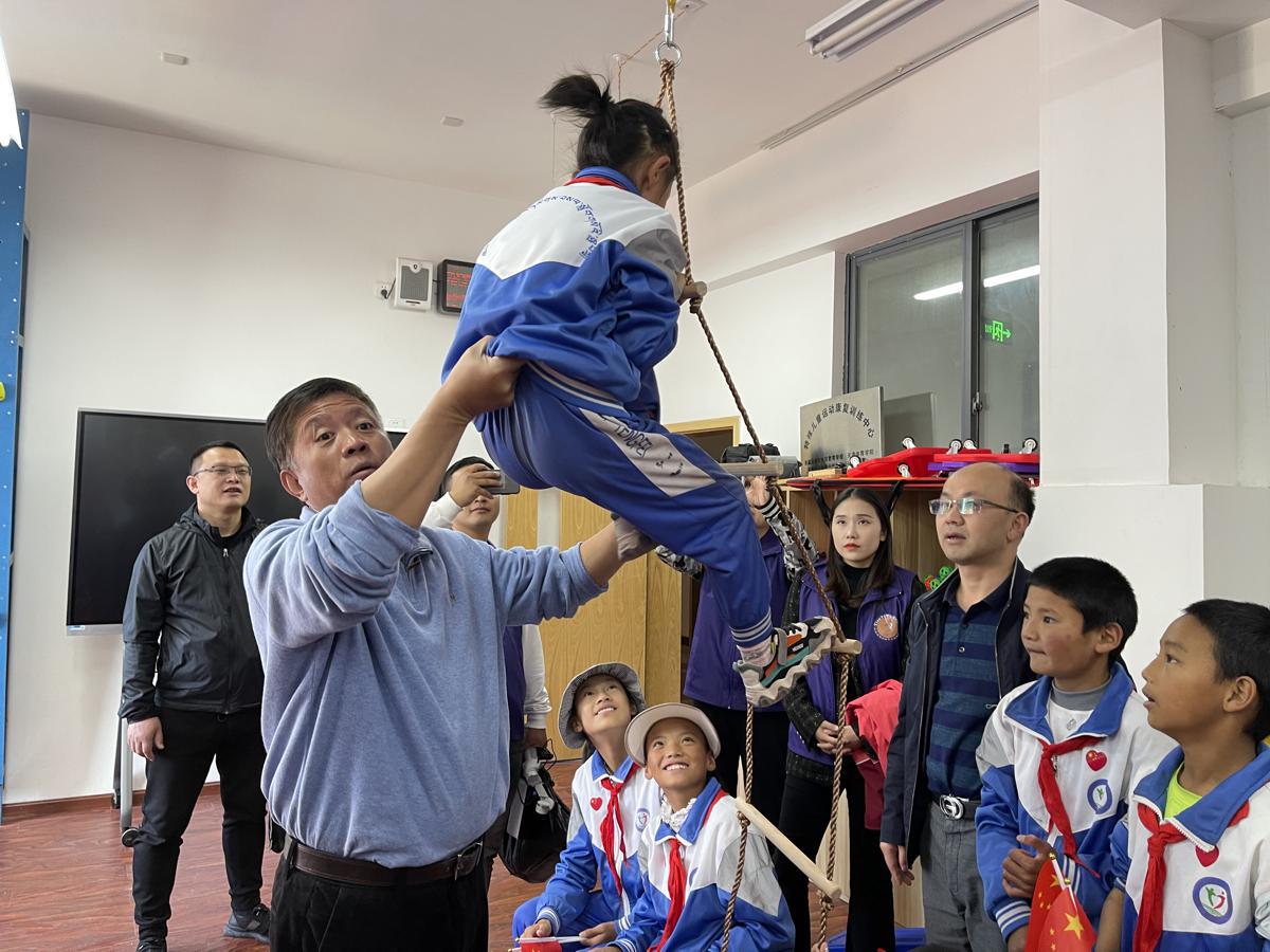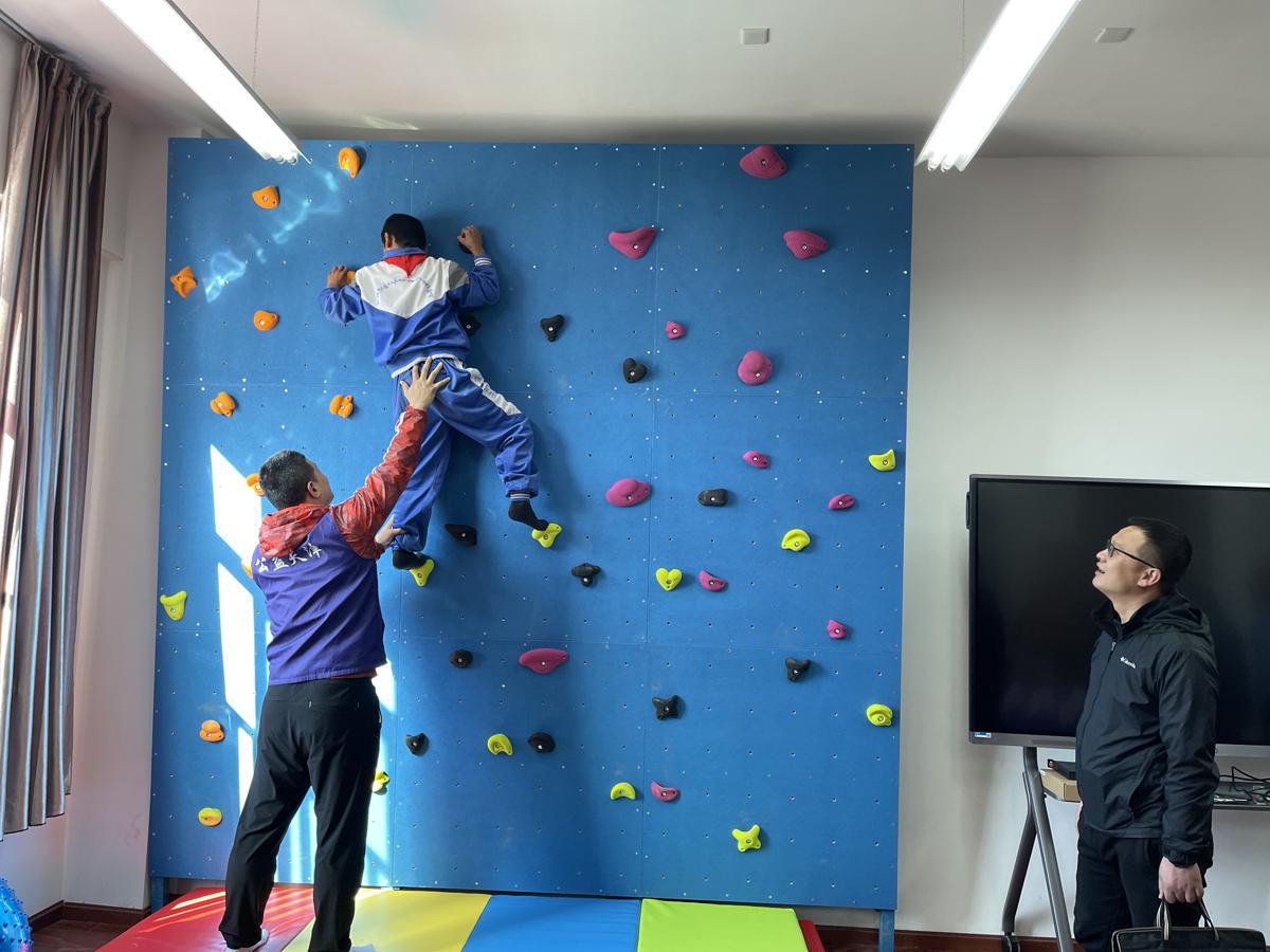 He He Jihua, absolwent Uniwersytetu Sportu w Tiencin i instruktor w ośrodku treningu rehabilitacji fizycznej w tybetańskim mieście Chamdo, pomaga dziecku we wspinaczce skałkowej. [Zdjęcie dostarczone do chinadaily.com.cn]