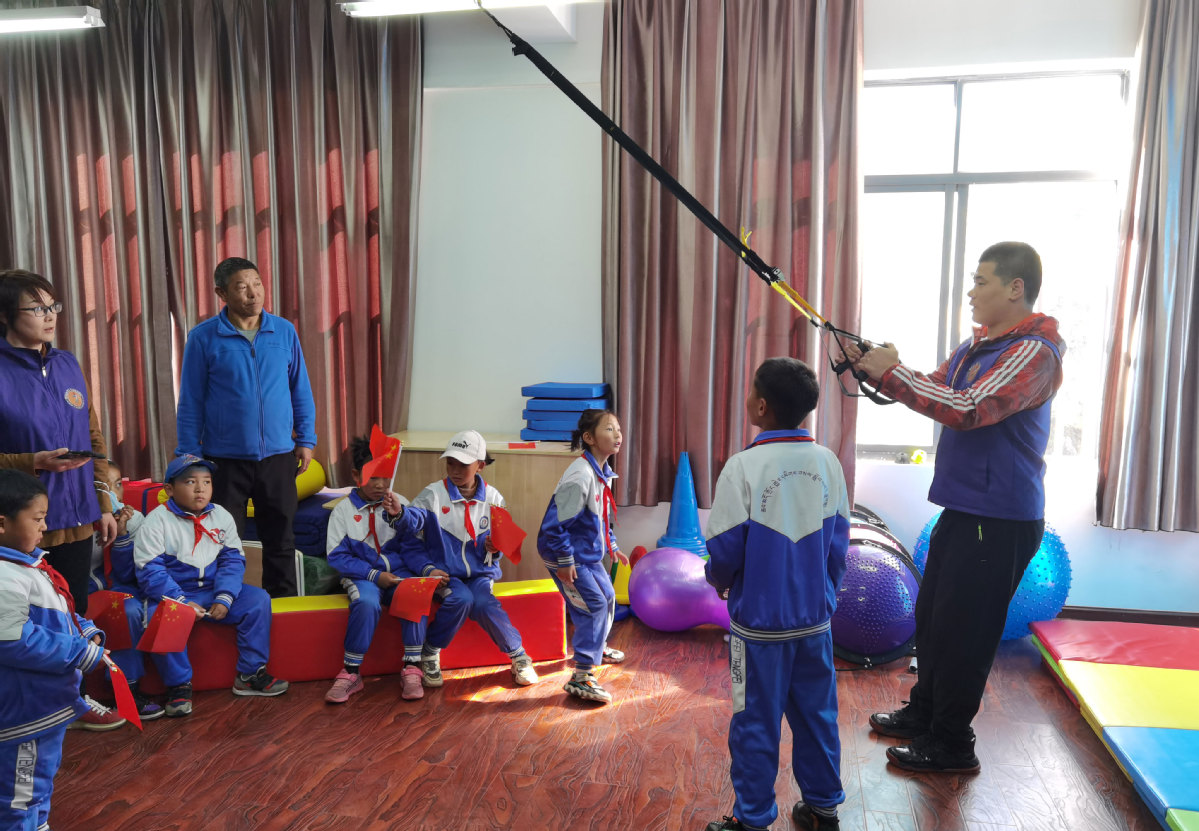He Jihua, absolwent Uniwersytetu Sportu w TTiencin i instruktor w ośrodku rehabilitacji fizycznej w Chamdo, prowadzi zajęcia z treningu fizycznego dla niepełnosprawnych uczniów. [Zdjęcie dostarczone do chinadaily.com.cn]