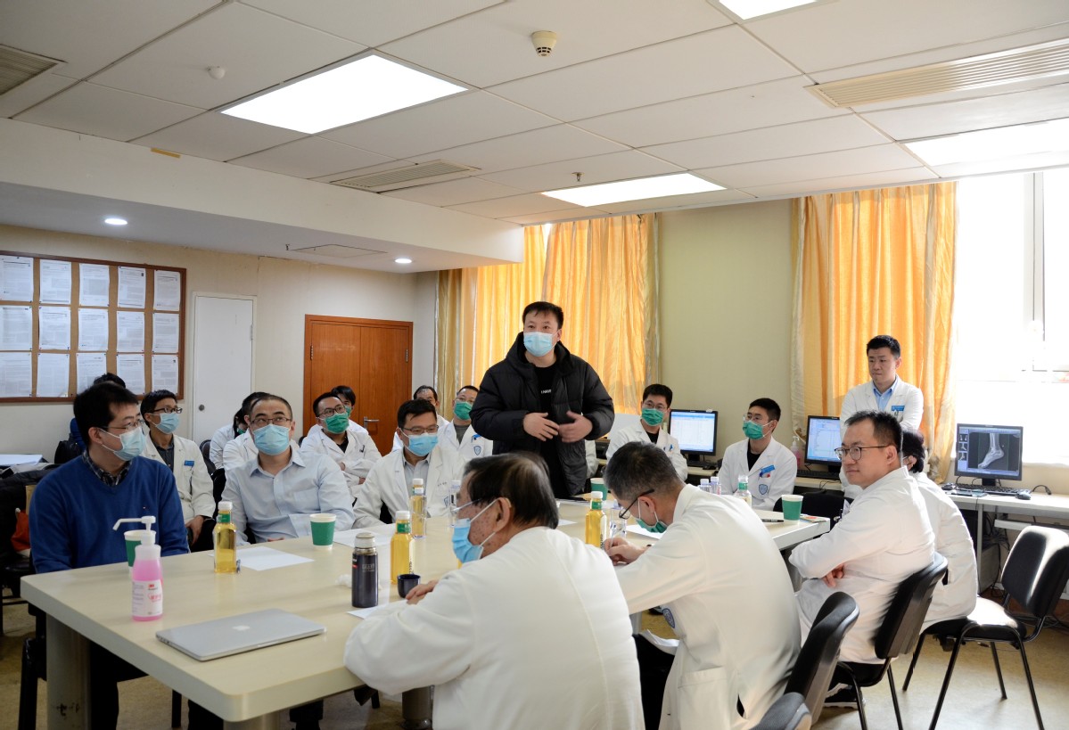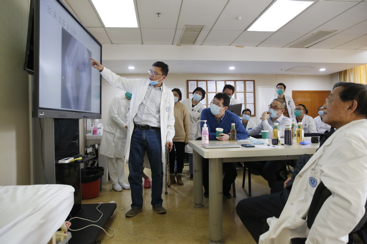 Lin Jianhao (drugi od lewej), dyrektor oddziału kości i stawów Szpitala Ludowego Uniwersytetu Pekińskiego, sprawdza prześwietlenie pacjenta. [Zdjęcie dostarczone do chinadaily.com.cn]