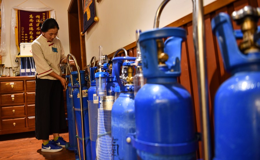 Pracownica przygotowująca zbiorniki z tlenem w tybetańskim ośrodku leczniczym w Lhasie, 14 kwietnia 2023 r. (Xinhua/Jigme Dordże)