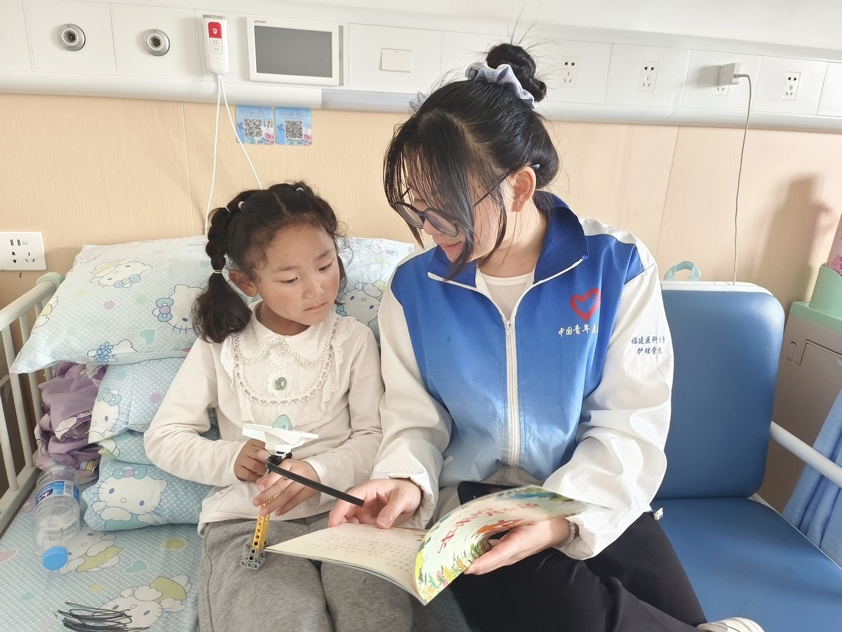 Tybetańska dziewczynka z wrodzoną wadą serca czyta książeczkę dla dzieci z pomocą pielęgniarki ze szpitala w Fuzhou w prowincji Fujian. [Zdjęcie dostarczone przez Fujian Children's Hospital do chinadaily.com.cn]