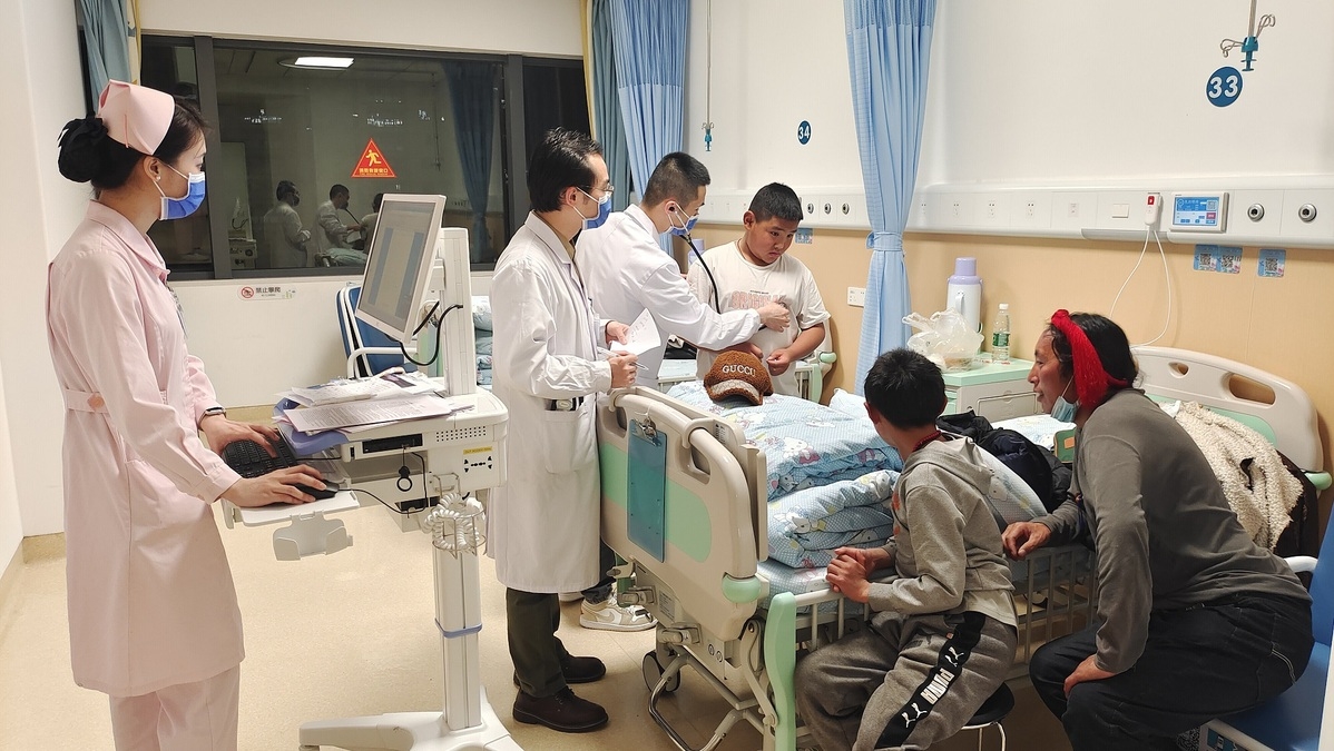 Lekarz ze Szpitala Dziecięcego Fujian sprawdza stan zdrowia chłopca z wrodzoną wadą serca z Tybetańskiego Regionu Autonomicznego. [Zdjęcie dostarczone przez Fujian Children's Hospital do chinadaily.com.cn]