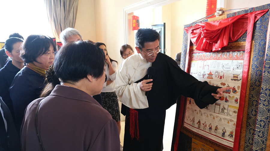 Zdwiedzający mogli obejrzeć obrazy przy pomocyTseringa, dyrektora Szpitala Medycyny Tybetańskiej w Tybetańskim Regionie Autonomicznym [Xizang]. Dyrektor wyjaśniał zawiłe szczegóły i kontekst historyczny dzieł sztuki, zapewniając głębsze zrozumienie ich znaczenia.
