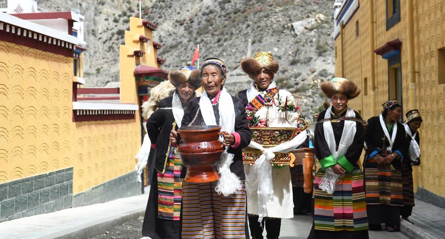 Rolniczka Dainzin Quzhen (z przodu) wraz członkami rodziny odprawia tradycyjny obrządek przed wprowadzeniem się do swojego nowego domu w dzielnicy Lhozhag w mieście Shannan, 21 września 2019 r. (Xinhua / Jigme Dorje
