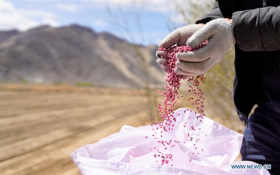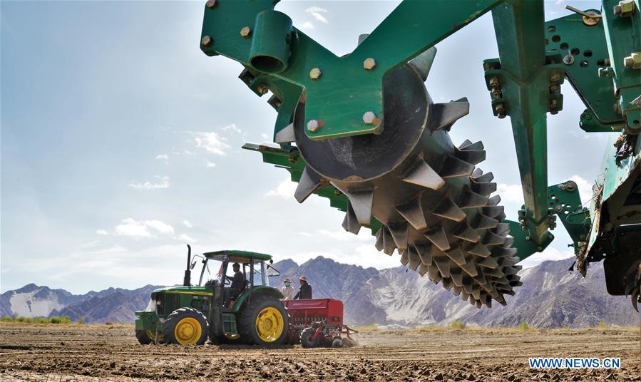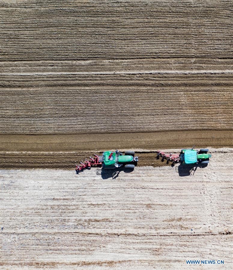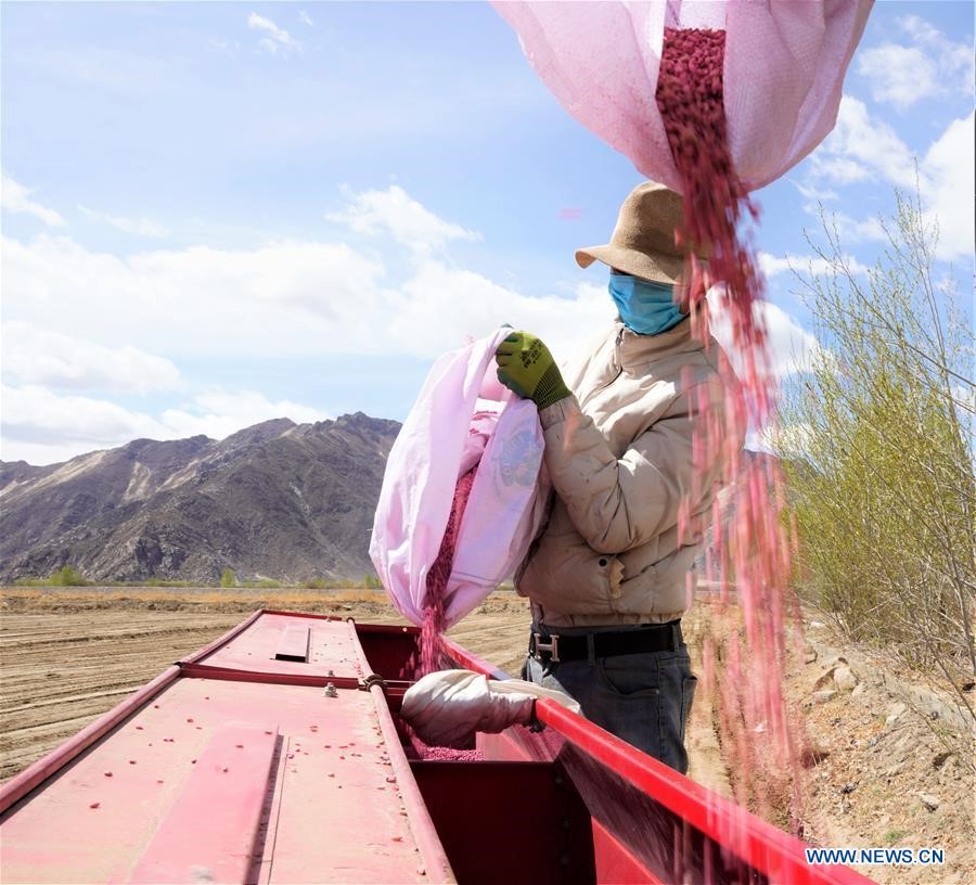 Poniższe zdjęcia lotnicze wykonano 22 kwietnia 2020 roku, ukazują tybetańskich rolników wysiewających jęczmień górski przy użyciu maszyn rolniczych na polach we wsi Chabalang w powiecie Quxu opodal Lhasy, stolicy i Tybetańskiego Regionu Autonomicznego. (Foto: Xinhua / Purbu Zhaxi)