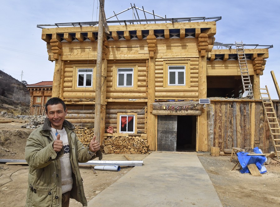Biedny niegdyś wieśniak pozuje dziś do zdjęcia przed swoim nowo wybudowanym domem we wsi Geka w gminie Mazi, w powiecie Dawu w Tybetańskiej Prefekturze Autonomicznej Garze, w prowincji Syczuan, 11 marca 2017 r.