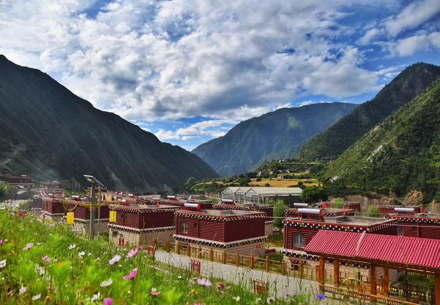 Zdjęcie zrobione 5 sierpnia 2020 r. Wioska Yuthok w powiecie Derge w Tybetańskiej Prefekturze Autonomicznej Garze, prowincji Syczuan w Chinach. (Xinhua / Zhou Xiangji)