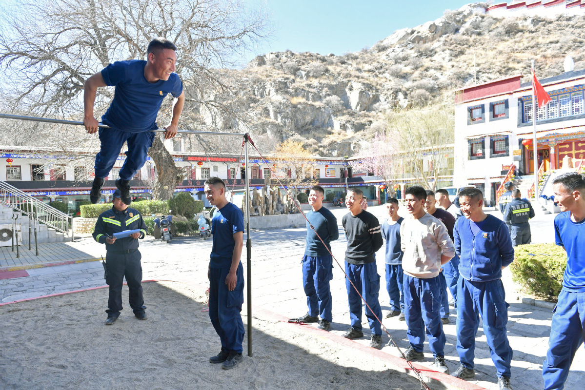 Strażacy tybetańscy, oprócz typowej służby, zajmują się również ochroną słynnego Pałacu Potala. Na fotografii zbiórka pododdziału przed rozpoczęciem patrolu obiektu.Lhasa - 4 marca br (Sun Ruibo/Xinhua).