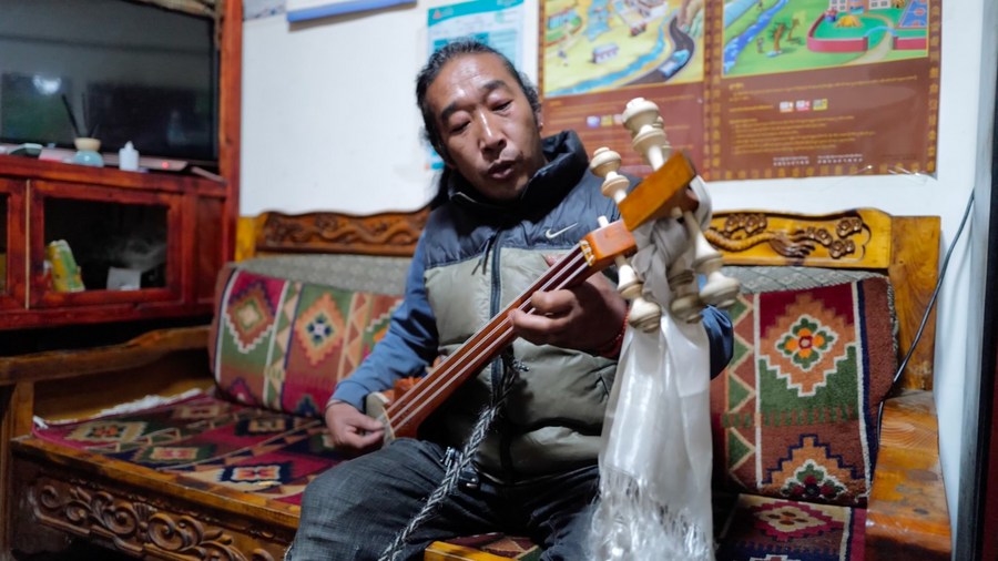 Tashi Tsering gra na tradycyjnym tybetańskim instrumencie muzycznym w swojej herbaciarni.[Fot.Xinhua/Luo Bo]