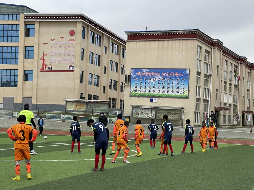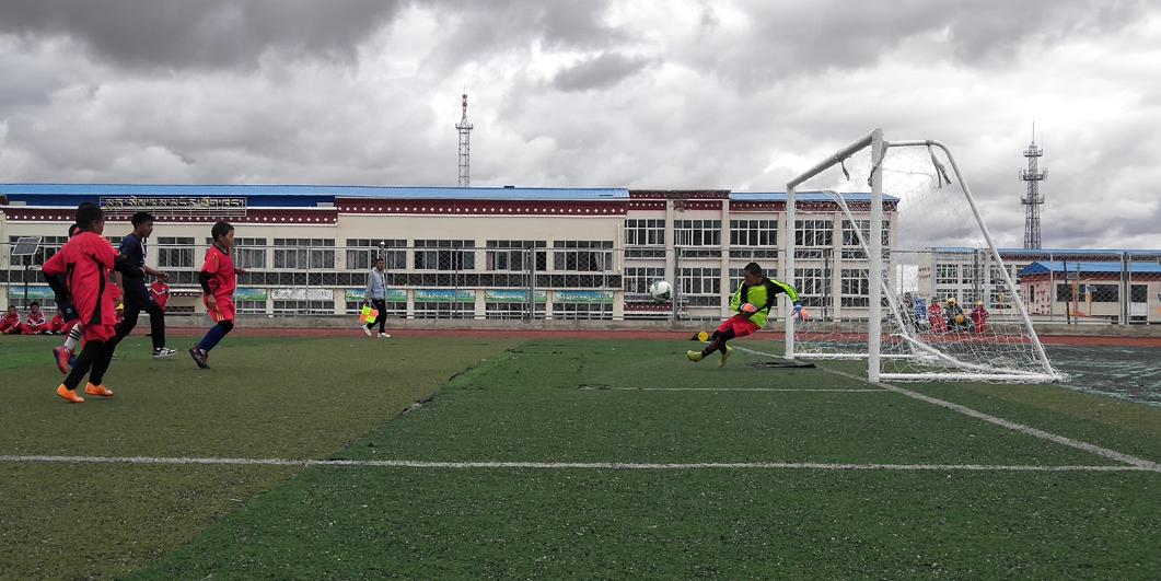 Uczniowie szkoły podstawowej w Nagchu w Tybecie grają w piłkę nożną na szkolnym boisku. [Zdjęcie dostarczone do chinadaily.com.cn]