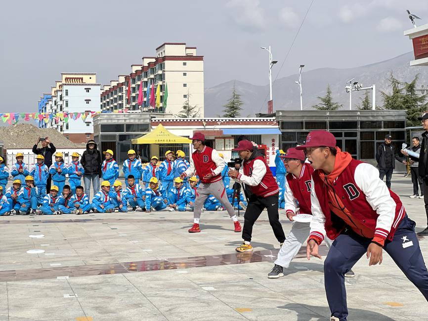 Trenerzy frisbee z firmy Tibet Dreamer Sports Culture Development Co (Tybetańska Wzja Rozwoju Kultury Sportowej) uczą uczniów oddziału Dongcheng Eksperymentalnej Szkoły Podstawowej w Lhasie zasad gry. [Zdjęcie: Dekyi Drolma/dla chinadaily.com.cn]