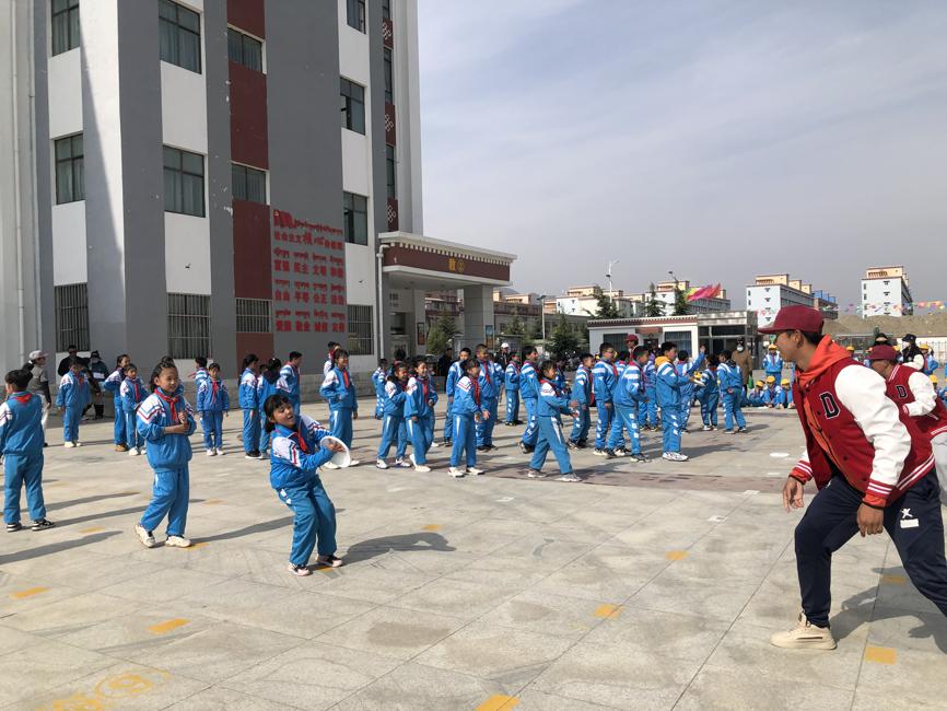 Pod okiem krajowego trenera frisbee i trenerów miejscowych uczniowie z oddziału Dongcheng Eksperymentalnej Szkoły Podstawowej w Lhasie spróbowali grać w najmodniejszą grę sportową na terenie kampusu.