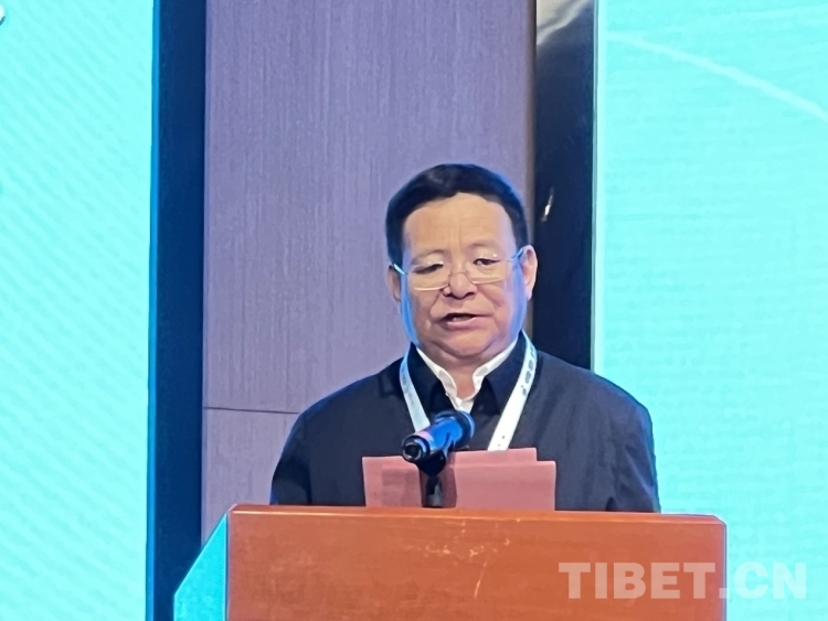 Na zdjęciu Yixi Jiacuo, przewodniczący komitetu organizacyjnego Krajowej Konferencji Współpracy Mediów Wydawanych w Języku Tybetańskim i zastępca redaktora naczelnego „Tibet Daily”, wygłasza okolicznościowe przemówienie