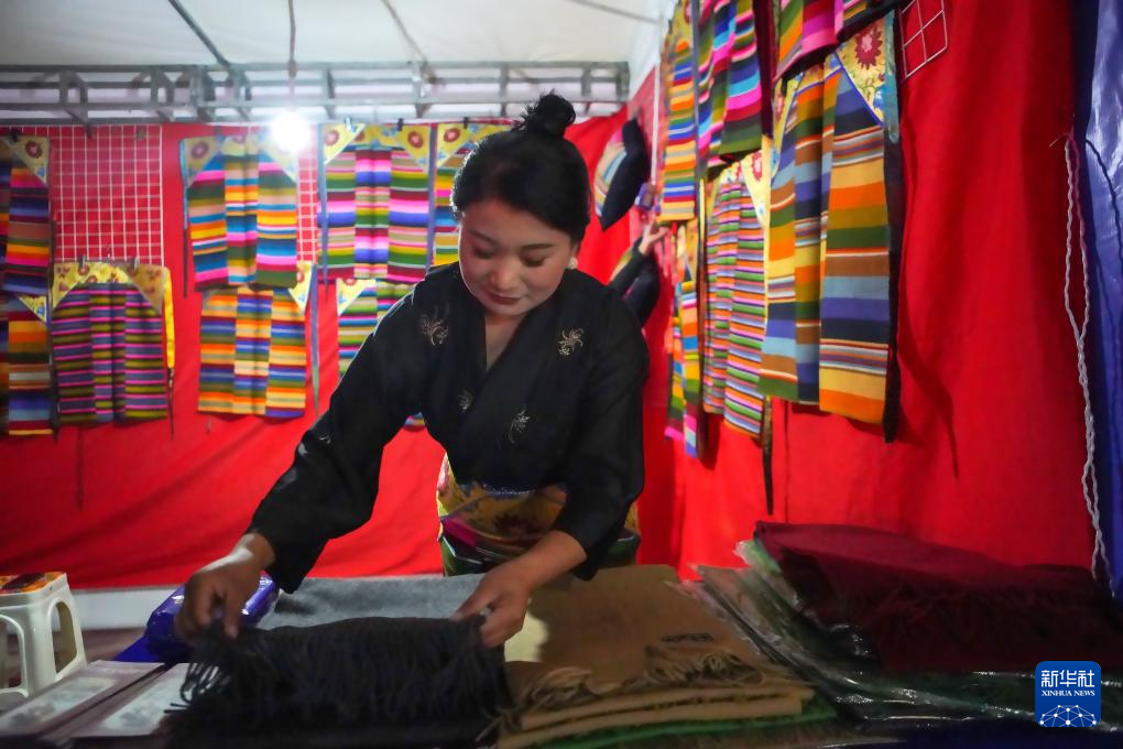Tenzin Zhuoga, kontynuatorka tradycyjnych umiejętności tkackich tybetańskiego Bangdian, prezentuje swoje wyroby na nocnym targu. [Zdjęcie: reporter agencji informacyjnej Xinhua, Shao Zedong]